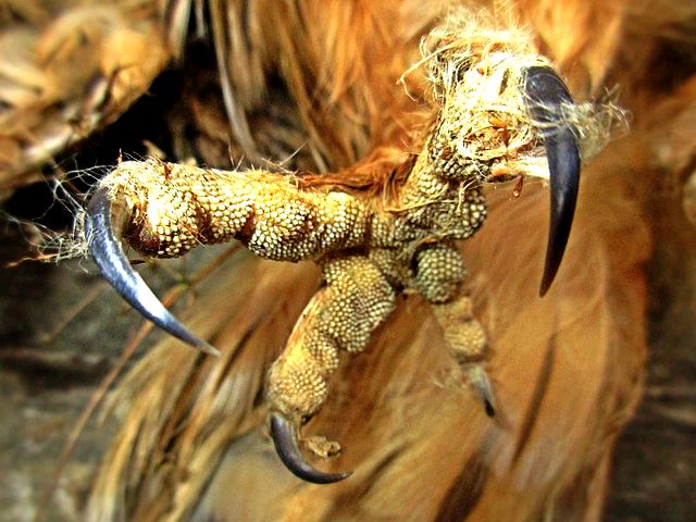 Horgas, éles és hegyes csőre kiváló fegyver, ezzel üti agyon a lábával megfogott áldozatát. A táplálék megkeresésében hallása és látása segíti. |