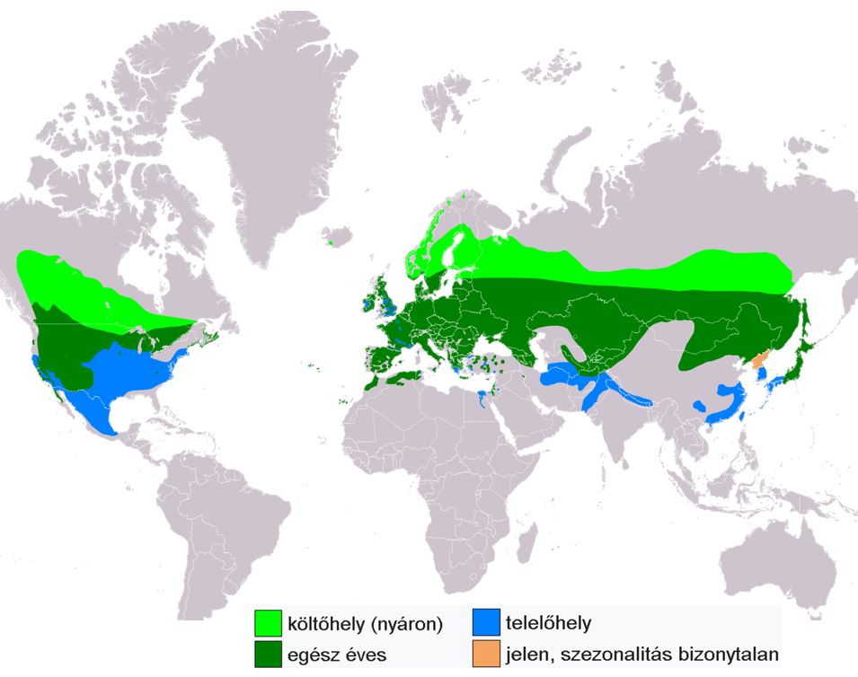 Európa és Ázsia mérsékelt égövi vidékein, a Földközi-tenger vidékén, Észak-Afrikában, a Közel-Keleten, valamint Kínával bezárólag Ázsiában élnek. Behurcolták Új-Zélandra és Nagy-Britanniába, ahol Angliában és Walesben elterjedt madárfajjá vált. |