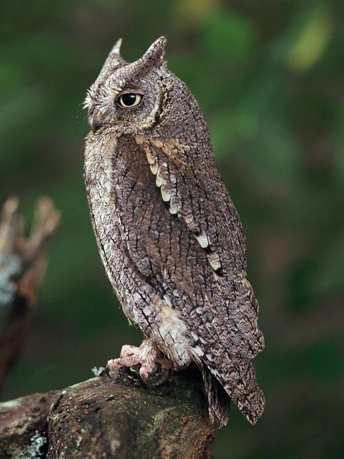 Testhossza 19-21 centiméter, szárnyfesztávolsága 55-65 centiméter, testtömege pedig évszaktól függően változik. 80-95 gramm között. Fakéregszínű, szürke, barna és fekete tónusú álcázó tollazata szinte láthatatlanná teszi ezt a kis madarat. A tollbóbitának semmi köze nincs a hallószervhez. Veszély esetén a bagoly lesimítja a tollazatát, merev, egyenes tartást vesz fel, és félig behunyja a szemét. Ilyenkor letört ághoz hasonlít. Ez a testtartás csak nappal figyelhető meg. |