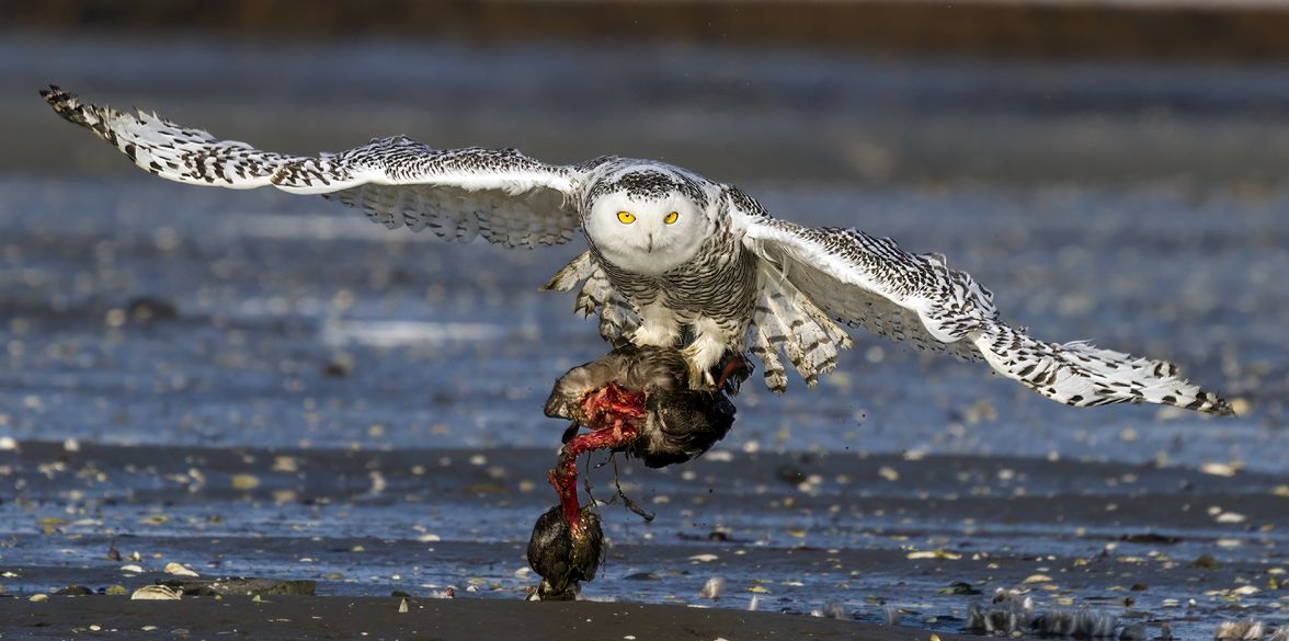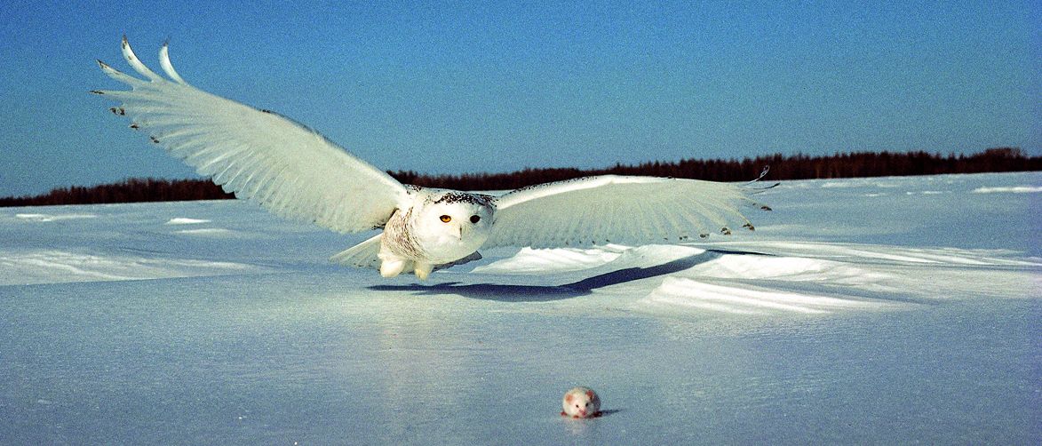 A fiókák körülbelül 25 nap után kezdenek repülni, és 5-7 hetes korukban kezdenek el saját maguk vadászni. Fiókáit agresszívan védi, még az emberre is képes rátámadni. Azokban az években, amikor kevés a zsákmányállat, a hóbagoly lemond a költésről, és nem nevel utódokat. |