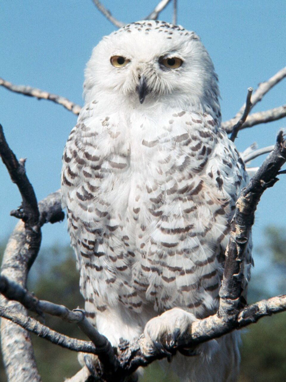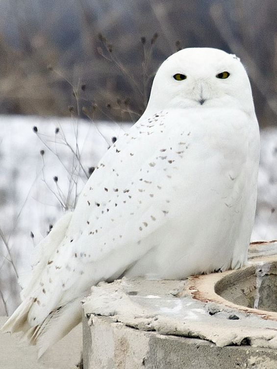 Méretben majdnem eléri az uhu (Bubo bubo) nagyságát. A kifejlett egyedek testhossza 52-70 centiméter, szárnyfesztávolsága 125-145 centiméter. A tojó egyötödével nagyobb, mint a hím. A hím egyedek 52-65 centiméter hosszúak, míg a tojók 60-70 centiméteresek is lehetnek. A testtömeg alakulása is hasonló a két ivarnál. A kisebb testű hímek tömege 0,7-2,5 kilogramm, míg a testesebb tojók 0,8-3 kilogramm tömegűek. A hím tollazata majdnem teljesen fehér. A tojó tollazata fehér, sötéten mintázva, ami jó álca költéskor. A fiókák tollazata szürke színű. Feje - mint minden bagolyfajé - kerek. Fekete csőrének tövét sűrűn beborítják az apró pehelytollak. Szemei sárga színűek. |