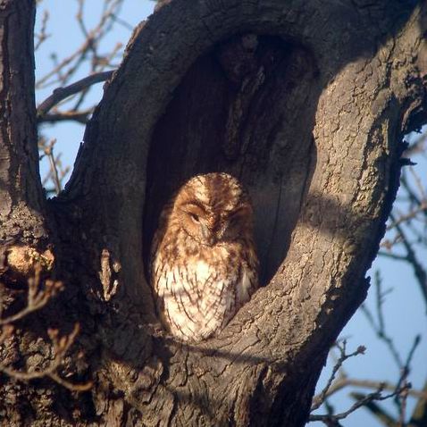 Csupán embermagasságban ül néha és ha úgy haladunk el mellette, hogy azt hiszi, nem vettük észre, nem repül el, csak nagy szemével kíséri minden mozdulatunkat. A telelő csoport a tél végéig, március elejéig marad együtt, majd párokra bomlik. A telet gyakran a településekre húzódva, általában örökzöldeken vészeli át. |