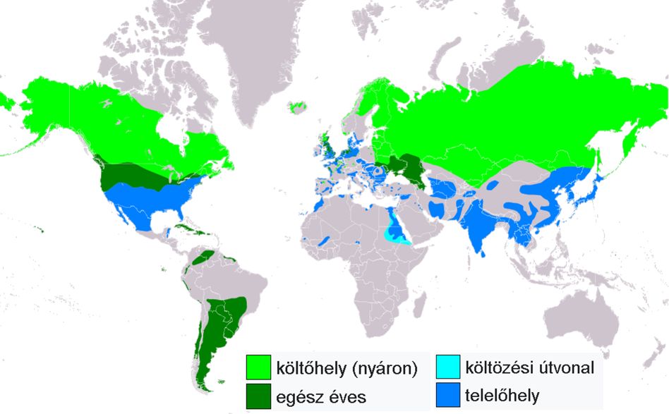 Az Antarktisz és Ausztrália kivételével minden kontinensen előfordul, így az egyik legelterjedtebb madárfaj. Európában, Ázsiában, Észak- és Dél-Amerikában, a Karib-térségben, Hawaiin és a Galápagos-szigeteken költ. Részben vándorló madár, télen délre költözik elterjedési területének északi részeiről. Magyarországon rendszeres, kisszámban fészkel a Hanságban és a Hortobágyon. |
