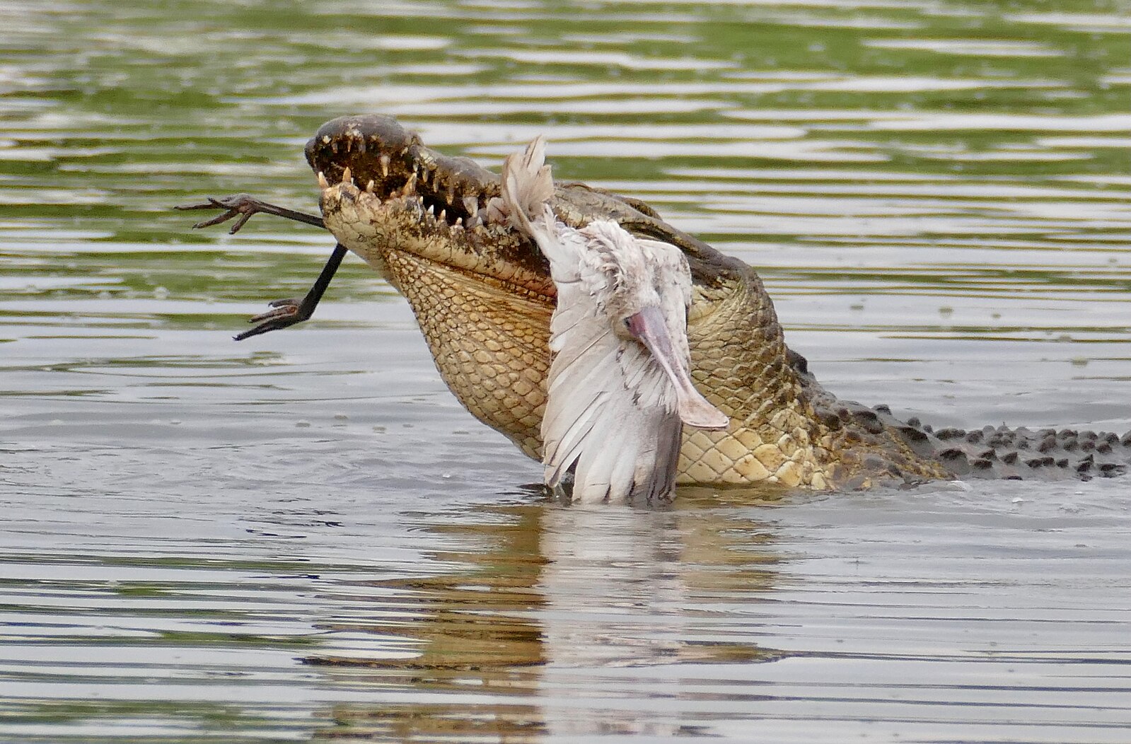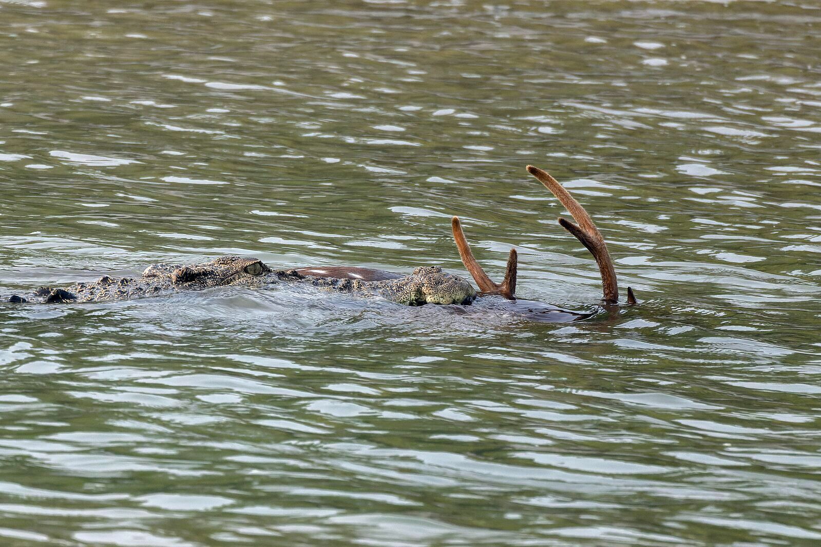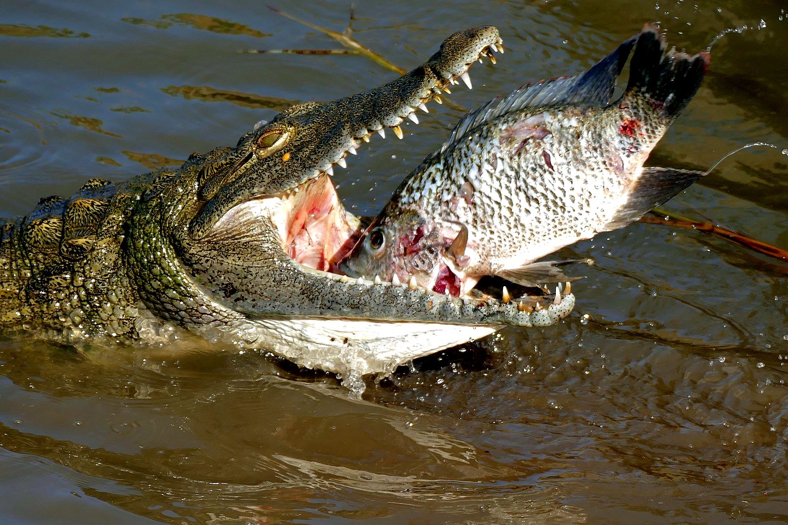 Erős állkapcsával megragadja, majd a víz alá húzza nagy testű áldozatát és az ott megfullad. Mivel rágni nem tud, a nagyobb állatokat többen összefogva tépik szét, jellegzetes halálforgás közben. |