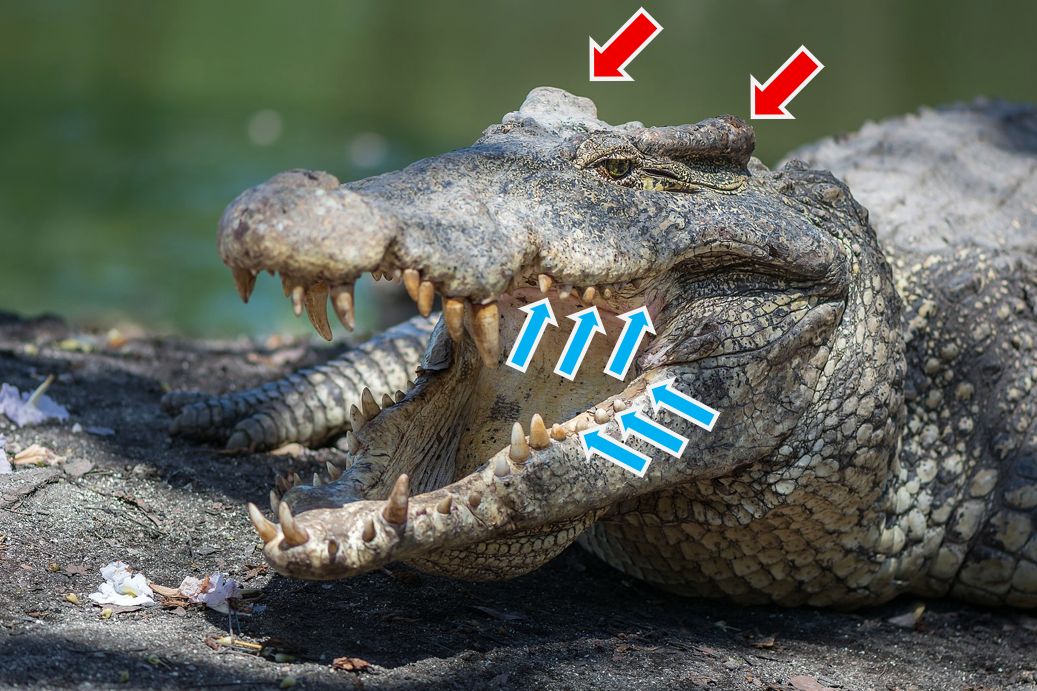 Erős állkapcsuk és farkuk félelmetes ragadozóvá teszi őket. A vízalatti lopakodást segítve a szemük, orrlyukaik és fülnyílásuk is a fejük felső részén helyezkedik el. Szemüket hártyával tudják védeni és könnymirigyük is van. Két sor pikkelyborda húzódik végig a hátán egész a farkáig. |