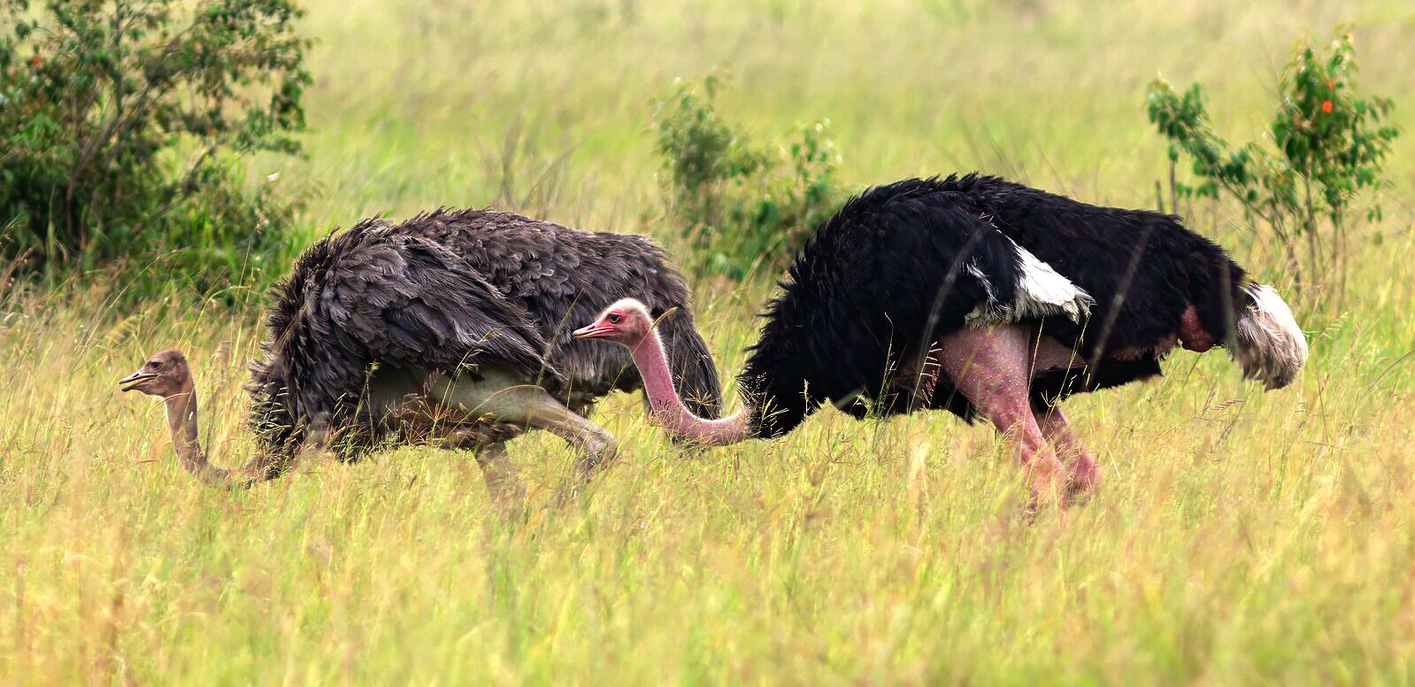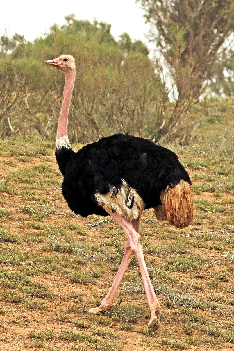A legnagyobb testű, Afrika és betelepítve Dél-Ausztrália füves szavannáiban és sivatagos vidékein ma is élő madárfaj. A kakas 210-275 cm magasra nő, teste nagyjából 2 m hosszú, a tömege 100-150 kg. A tojó kisebb 175-190 cm magasságú és 90-110 kg tömegű. Nyaka rózsásvörös, a kakas tollazata fekete-fehér, a tojóé pedig szürke. Feje és nyaka csupasz. A nyílt, belátható, füves szavannák, félsivatagok lakója. A száraz környezethez alkalmazkodva a szomjazást napokig bírja. A homokban fürödve tisztálkodik. Jól fut, eközben négyméteres lépteivel a 70 km/h sebességet is eléri. |