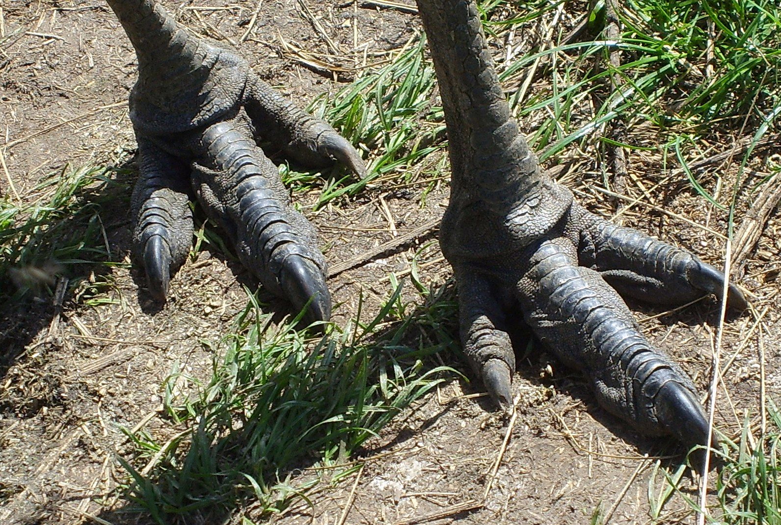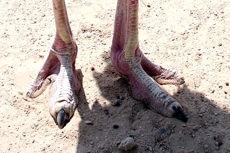 Lábai hosszúak, erősek, melyeken csak két ujj van. A belső ujj erősebb és nagyobb, mint a külső. Az ujjak végén tompa karmokat visel, erős rúgása az oroszlánra is veszélyes. |