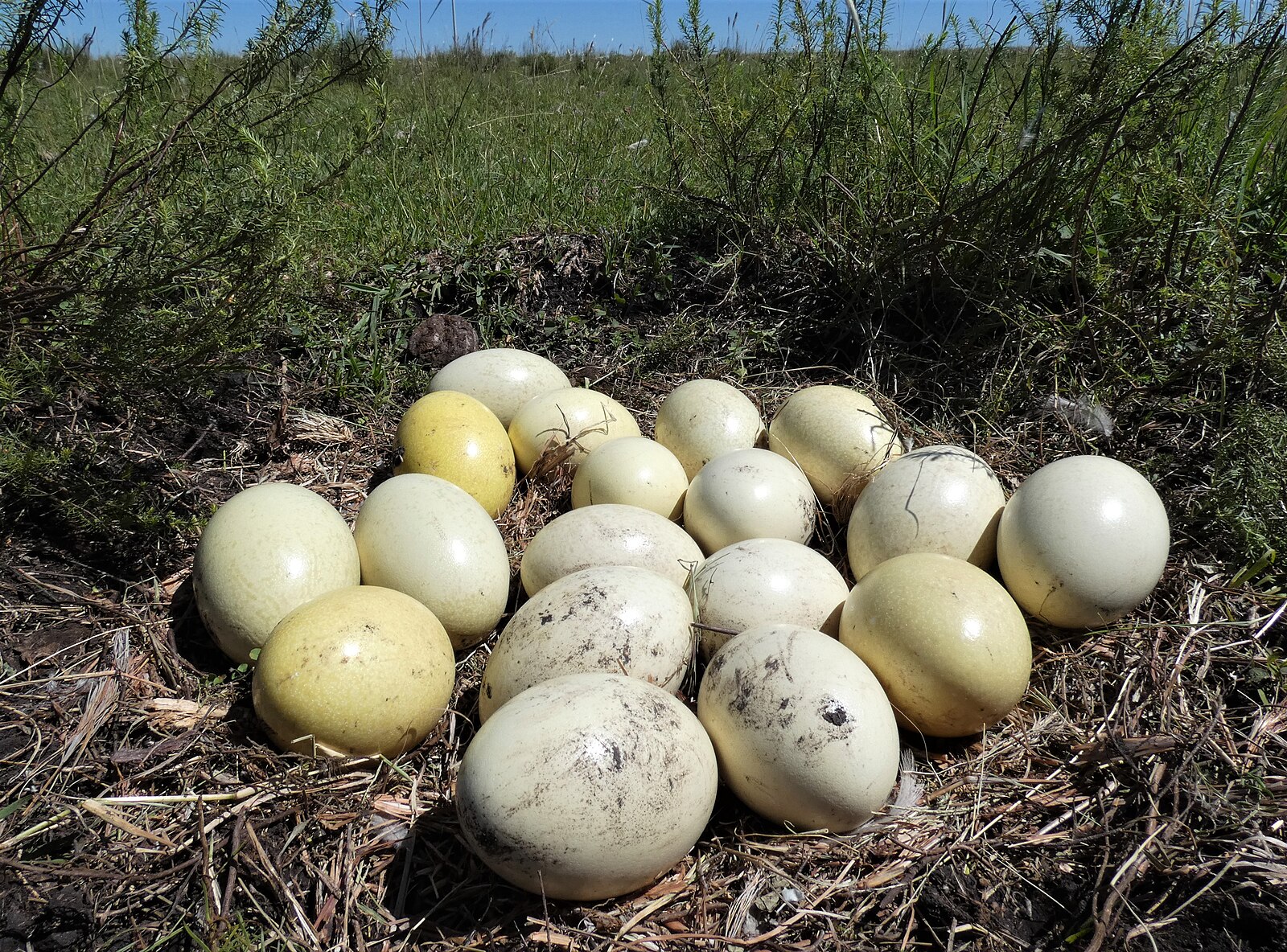 . A párzási időszakban hallatott jellegzetes hangjuk a messzehangzó "dobolás", amelyet a hosszú, felfújt légzacskójuk erősít fel. A tojó 5-25 db. átlagosan 8-10 sötétzöld színű tojást tojik. A 13 centiméter hosszú és 700-900 grammos tojás a tojó testsúlyának mindössze 1,5%-a, amely az egyik legkisebb arány a madarak világában. Az emuknál is felcserélődik a nemek szerepe a költés és az utódgondozás terén. A költés a hímek feladata. A nőstények sokszor a környéken maradnak, és kitartóan őrzik a területüket. |