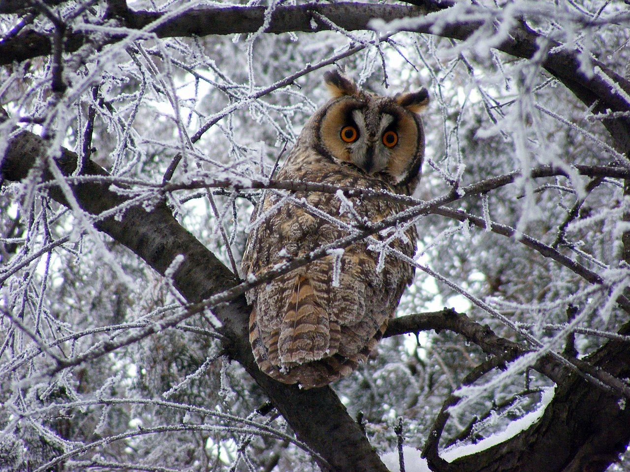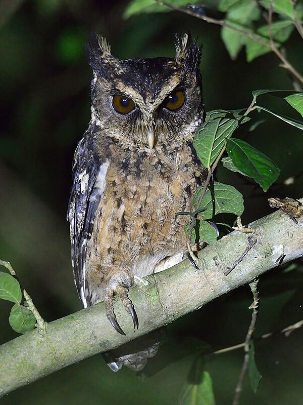 Közepes nagyságú bagoly. Testhossza 35-40 centiméter, szárnyfesztávolsága 90-100 centiméter, testtömege pedig 220-440 gramm közötti. Jól látható tollfülekkel és nagy, narancsvörös szemekkel rendelkezik. A hím, a tojó és a fiatalok hasonló színezetűek. |