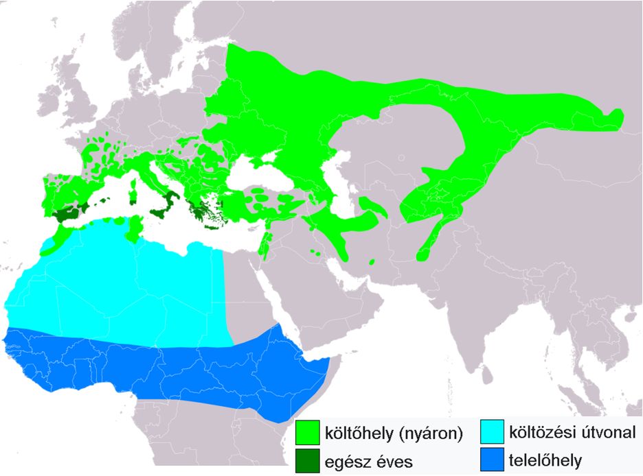 Dél-Európában, a Közel-Kelet egyes részein és Oroszország területén át egészen Mongóliáig húzódik a költőterülete. Télen a Szahara és az Egyenlítő közötti területre költözik. Az utóbbi években csökkent az állománya. Magyarországon kis számban, de rendszeres fészkel. |