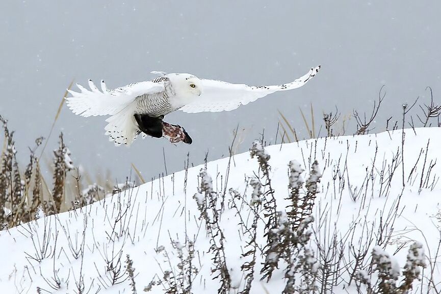 A fiókák körülbelül 25 nap után kezdenek repülni, és 5-7 hetes korukban kezdenek el saját maguk vadászni. Fiókáit agresszívan védi, még az emberre is képes rátámadni. Azokban az években, amikor kevés a zsákmányállat, a hóbagoly lemond a költésről, és nem nevel utódokat. |