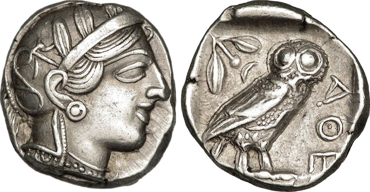 ![]() Pallas Athéné és a kuvik az ókori görög négy drachma értékű pénzérmén. |