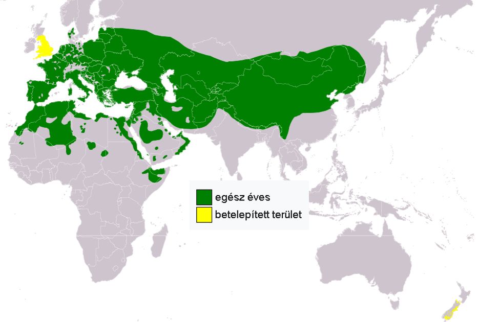 Európa és Ázsia mérsékelt égövi vidékein, a Földközi-tenger vidékén, Észak-Afrikában, a Közel-Keleten, valamint Kínával bezárólag Ázsiában élnek. Behurcolták Új-Zélandra és Nagy-Britanniába, ahol Angliában és Walesben elterjedt madárfajjá vált. |